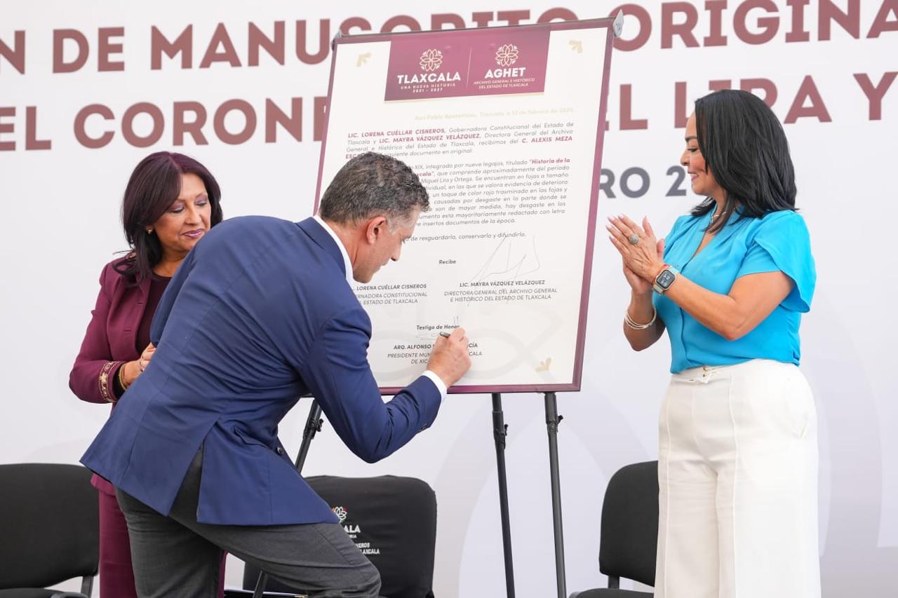 *La gobernadora Lorena Cuéllar Cisneros destacó que la donación fortalece la memoria histórica y el patrimonio documental del estado Tlaxcala,…
