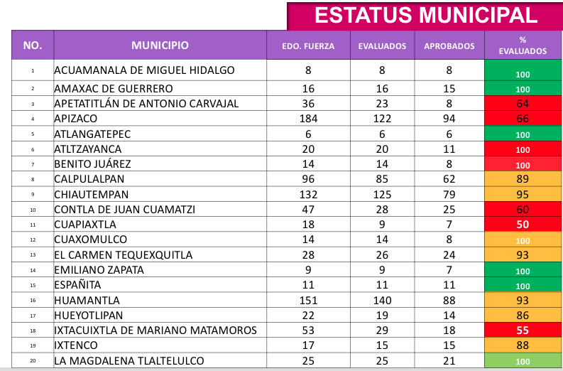 Tal es el caso de Apetatitlán, Apizaco, Contla, Cuapiaxtla, Ixtacuixtla, Papalotla, San Francisco Tetlanohcan, Santa Ana Nopalucan, Totolac y Xaltocan, en donde los porcentajes de certificación son menores a 66 del total de los elementos.
