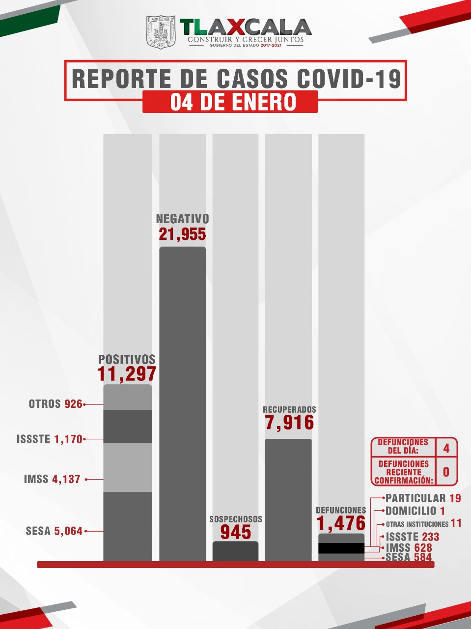 Tlaxcala, Tlax; 5 de enero de 2021 (Pulso) De acuerdo con el reporte del 04 de enero, la Secretaría de Salud del Estado (SESA) confirmó 55 personas recuperadas, 4 fallecimientos y 76 casos positivos de Covid-19 de tlaxcaltecas identificados en el estado y uno en otra entidad.