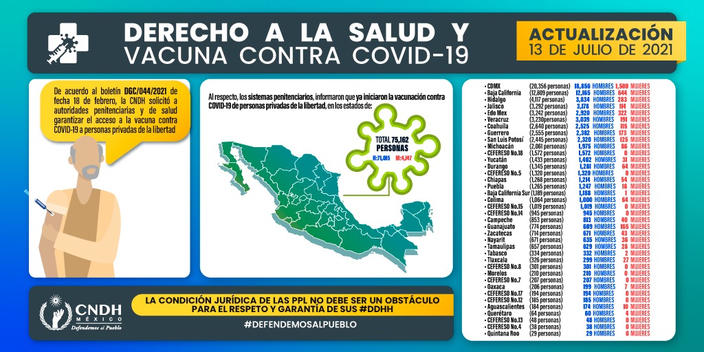 La CNDH reportó que del 1 de junio y el 13 de julio pasados, se logró la vacunación de 306 Personas Privadas de su Libertad, pues en su informe anterior solo se llevaba un avance de 20 personas y eran de los adultos mayoreos de 60 años.