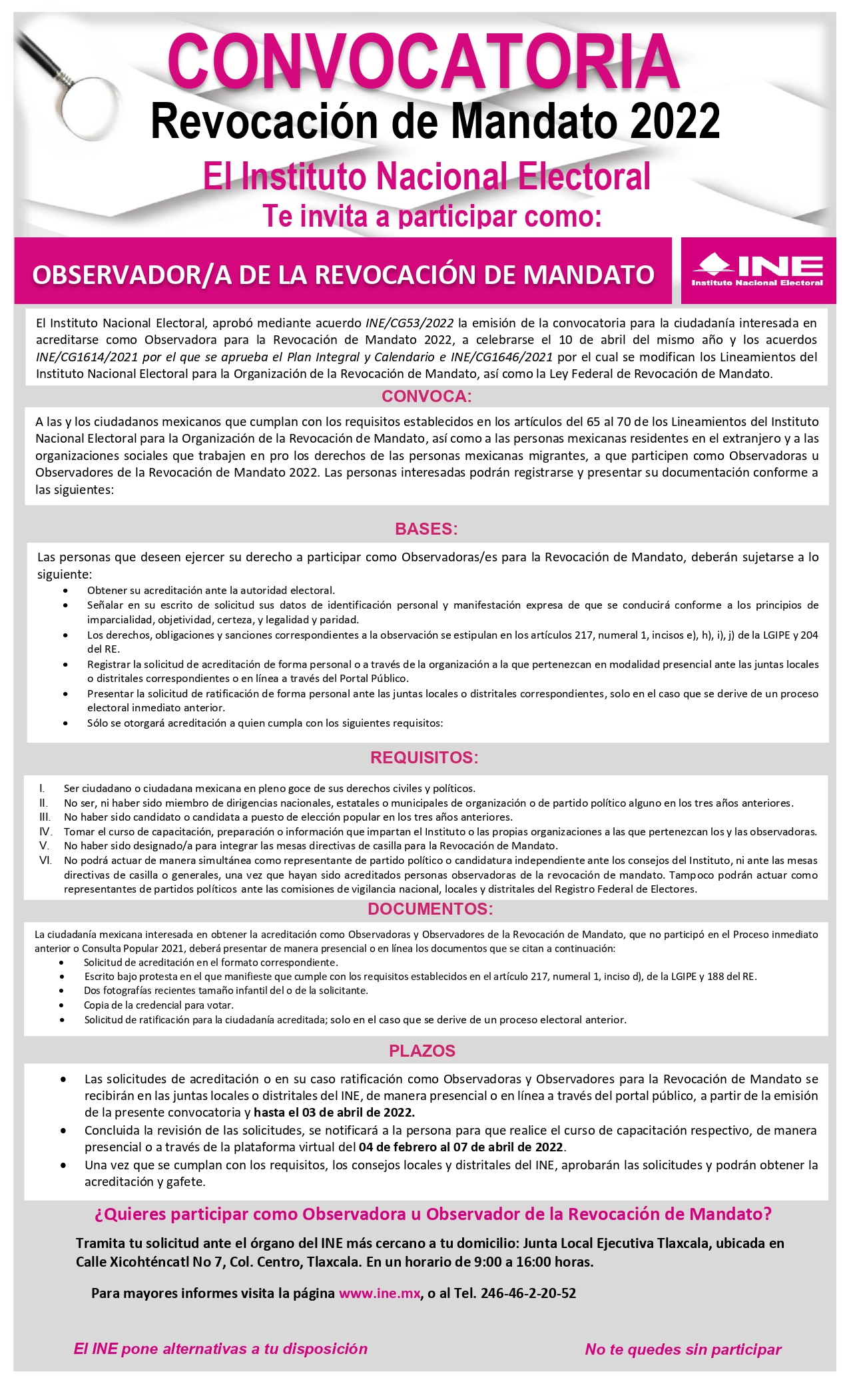 Tlaxcala, Tlax; 16 de febrero de 2022 (PulsoRed) Al ser la Revocación de Mandato del próximo 10 de abril un ejercicio inédito en la historia democrática del país, la Junta Local Ejecutiva del Instituto Nacional Electoral (INE) en Tlaxcala invitó a la ciudadanía a inscribirse como Observador u Observadora Electoral y verificar todas las etapas que se desarrollan en la entidad.