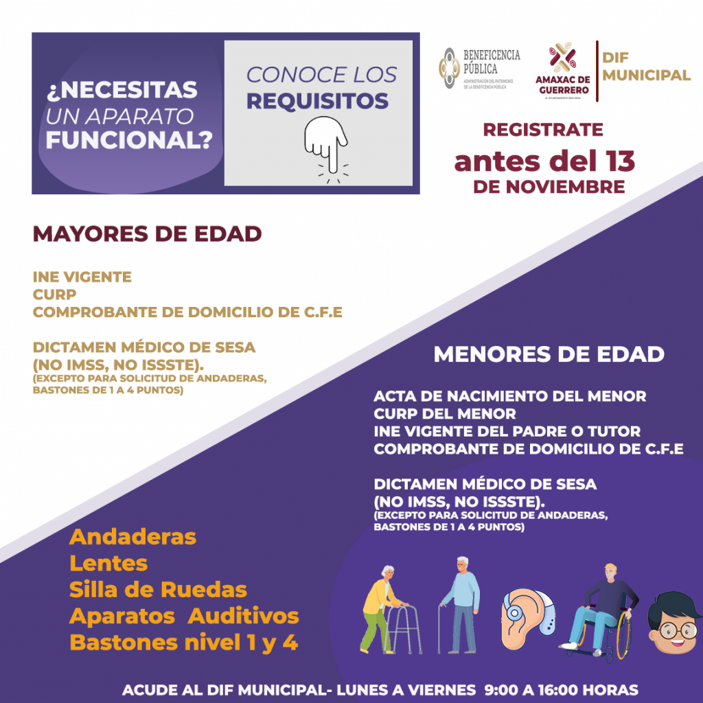 La directora del DIF, Teresa Molina Hernández, anunció que, hasta el 13 de noviembre, se recibirán las solicitudes para gestionar bastones nivel 1 y 4, andaderas, silla de ruedas, aparatos auditivos y lentes.