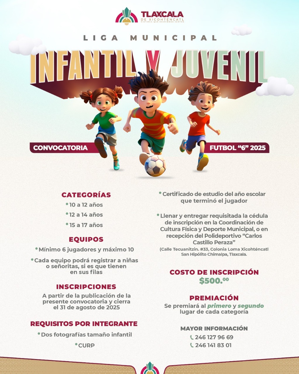 Tlaxcala, Tlax; 13 de agosto de 2025 (PulsoRed) Para promover la sana competitividad, convivencia y el gusto por la actividad física, el presidente municipal de Tlaxcala, Alfonso Sánchez García, a través de la Coordinación de Cultura Física y Deporte abrió la convocatoria para iniciar la Liga Infantil y Juvenil de Futbol 6, un nuevo espacio deportivo dirigido a niñas, niños y adolescentes del municipio.