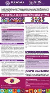 Tlaxcala, Tlax; 10 de abril de 2025 (PulsoRed) La Secretaría de Trabajo y Competitividad (STyC) lanzó la convocatoria 2025 del Programa de Economías Colectivas (PEC), una estrategia que busca fortalecer el bienestar económico y social de las y los tlaxcaltecas mediante el impulso a la cadena de valor de emprendimientos colectivos y la promoción de la economía social y solidaria.