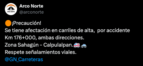 “Se tiene afectación en carriles de alta, por accidente Km 176+000, ambas direcciones. Zona Sahagún – Calpulalpan. Respete señalamientos viales”, compartió la cuenta oficial del Arco Norte a través de la red social “X”.