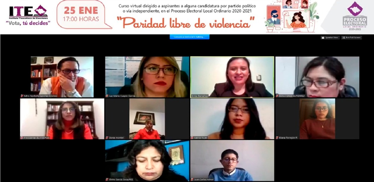 Tlaxcala, Tlax; 25 de enero de 2021 (Pulso) En el marco del Proceso Electoral Local Ordinario 2020-2021, el Instituto Tlaxcalteca de Elecciones (ITE) se reunió con mujeres que aspiran a diversos cargos de elección popular, con el propósito de darles a conocer el marco legal que prevalece en materia de violencia contra las mujeres en razón de género y los lineamientos de paridad en la postulación de candidaturas para esta elección.