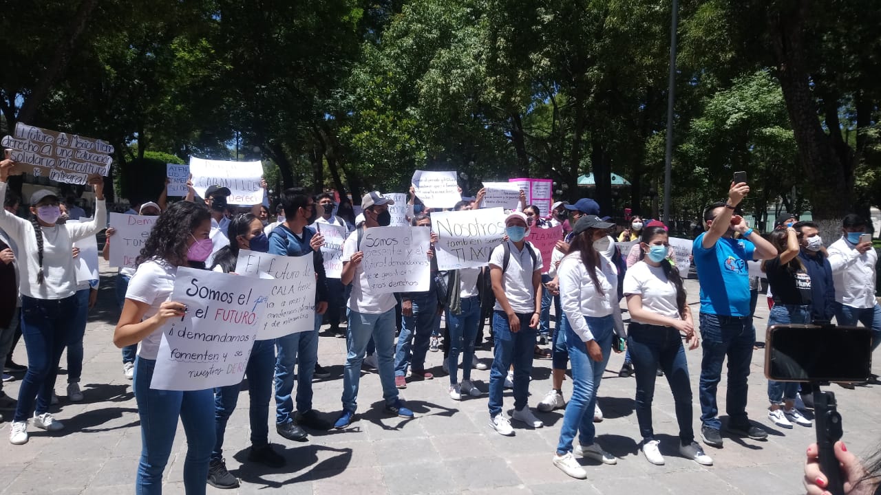 Tlaxcala, Tlax; 12 de mayo de 2022 (Ariadna Castro) Organizaciones civiiles, estudiantes y profesionistas tlaxcaltecas de diferentes organizaciones, encabezados por Javier Torres Hernández, de la asociación «Futumex» se manifiestaron la tarde de este jueves frente al Palacio de gobierno para exigir apoyos para dicho sector poblacional, al tiempo que acusaron de ser ignorados por las autoridades actuales.