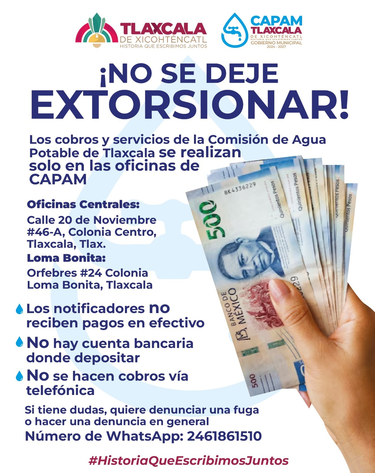 Tlaxcala, Tlax; 18 de octubre de 2024 (PulsoRed) El Gobierno Municipal de Tlaxcala de Xicohténcatl alerta a la población sobre intentos de fraude y extorsión llevados a cabo por individuos que se hacen pasar por notificadores de la Comisión de Agua Potable y Alcantarillado del Municipio (CAPAM). Estas personas solicitan pagos en efectivo o depósitos a cuentas bancarias, en nombre de la institución.