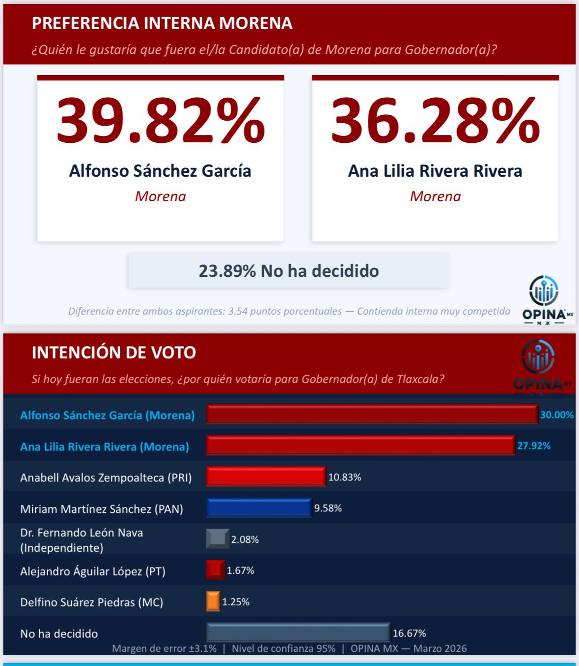 Tlaxcala, Tlax; 17 de marzo de 2026 (PulsoRed) Las cifras de marzo consolidan una realidad política innegable: Alfonso Sánchez García se ha posicionado como el eje central de la sucesión gubernamental en Tlaxcala. Según el más reciente estudio de OPINA MX, Sánchez García lidera la preferencia interna con un 39.82%, marcando una ruta clara y ascendente que lo separa de cualquier otra alternativa. Este avance no es fortuito; es el reflejo de una confianza ciudadana que busca eficacia por encima de la retórica tradicional.
