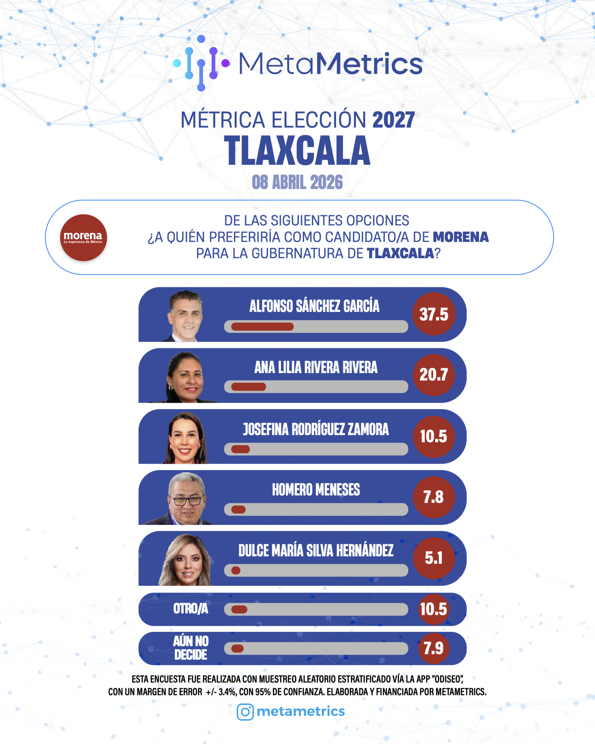 Tlaxcala, Tlax; 08 de abril de 2026 (PulsoRed) Los más recientes datos de medición electoral en Tlaxcala confirman una tendencia clara y contundente: Alfonso Sánchez García se posiciona como el perfil con mayor preferencia rumbo a la definición de la candidatura de Morena para la gubernatura en 2027.