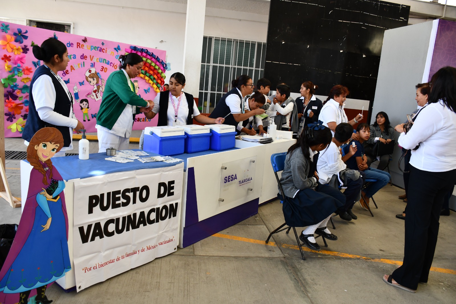 Autoridades estatales y federales del sector visitaron este jueves la Escuela Primaria Ignacio Manuel Altamirano, del municipio de San José Teacalco, donde el director de Atención Primaria a la Salud, Hugo Celis Galicia, en representación del secretario de Salud, Rigoberto Zamudio Meneses, afirmó que, a través, de diversas instituciones de salud y educativas, se implementan acciones para que la niñez de Tlaxcala cuente con su esquema de vacunación completo.