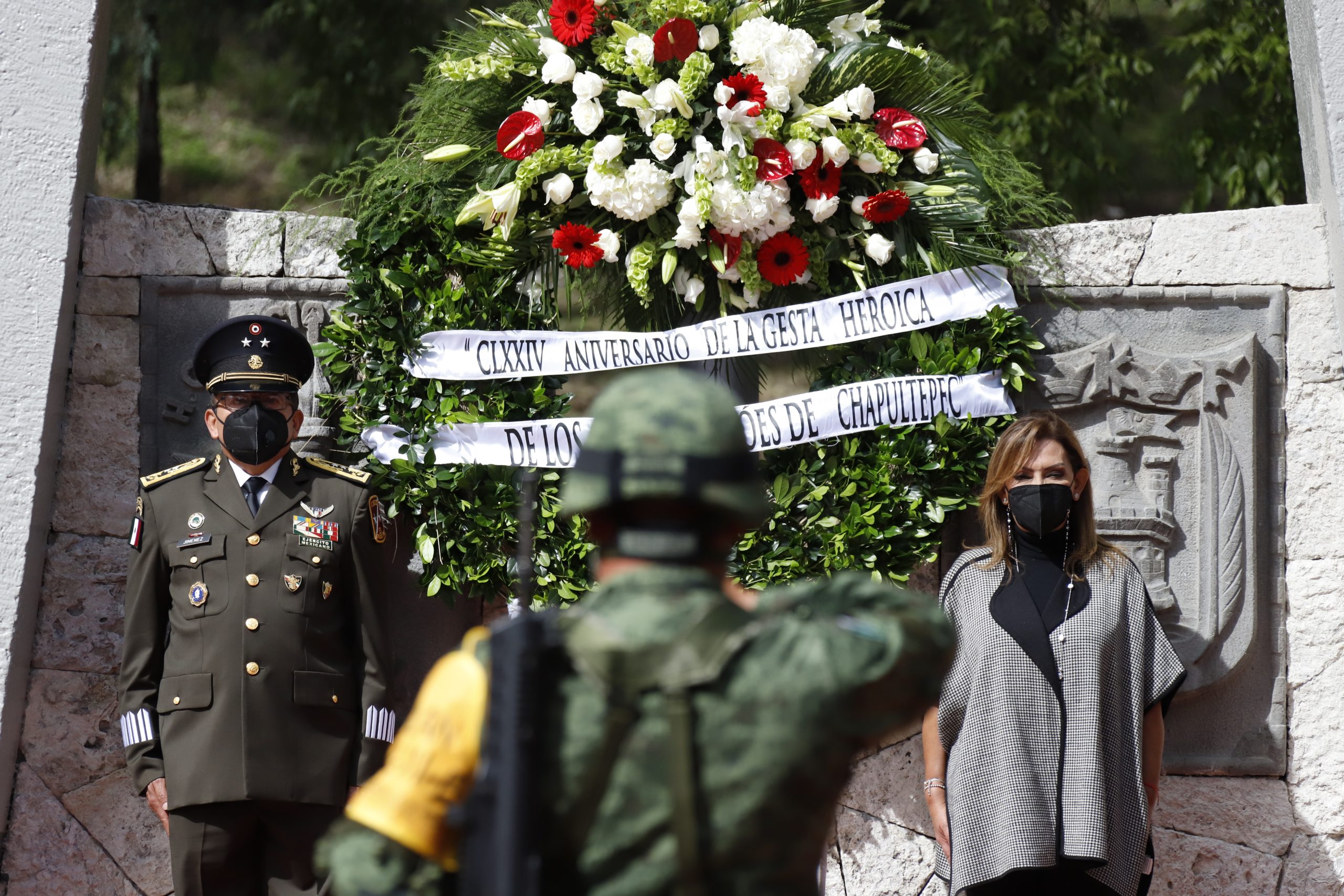 • La titular del Ejecutivo, autoridades civiles y militares depositaron ofrenda floral en el monumento a los cadetes.