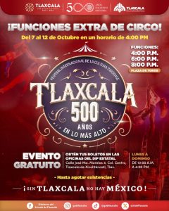 Tlaxcala, Tlax; 07 de octubre de 2025 (PulsoRed) El Gobierno del Estado anunció que, a partir de este 7 de octubre, se realizarán funciones adicionales a las 16:00 horas del Festival Internacional de la Cultura Circense 500 Años, que tiene lugar en la Plaza de Toros Jorge “El Ranchero” Aguilar, como parte de los festejos por el medio siglo de la fundación de la ciudad de Tlaxcala.