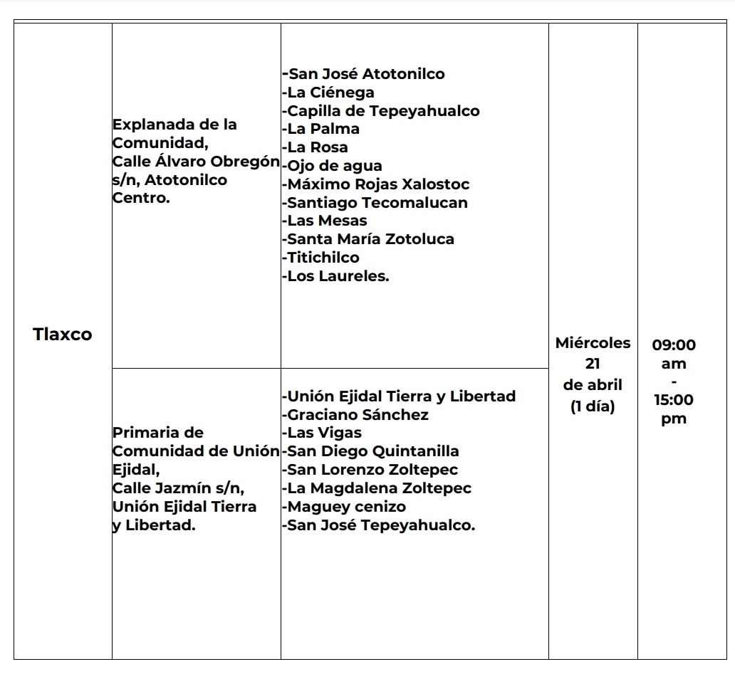 En Tlaxco las sedes son la explanada del centro expositor de la demarcación, la explanada del centro expositor de la comunidad de Atotonilco y en la primaria de Comunidad de Unión Ejidal.