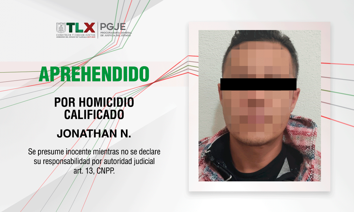 Tlaxcala, Tlax; 8 de julio de 2021 (Pulso) Tras acreditar su participación en el homicidio de un hombre en 2018, Jonathan N., fue capturado por oficiales de la Policía de Investigación adscritos a la Procuraduría General de Justicia del Estado (PGJE), e ingresado al Centro de Reinserción Social (Cereso), donde enfrentará su proceso legal.