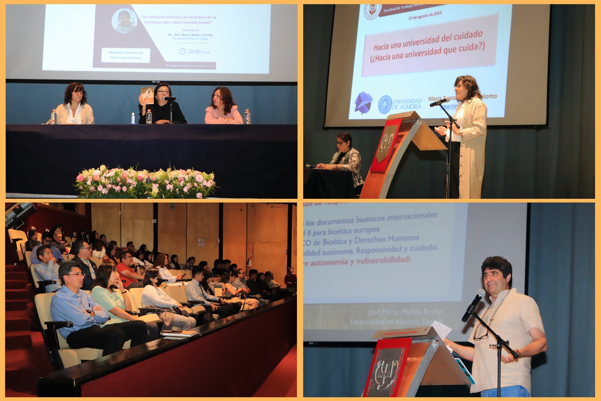 Este programa comprendió la presentación de la conferencia intitulada: “Hacia una universidad del cuidado”, impartida por la Doctora María Teresa Martín Palomo, así como “La reflexión bioética en términos de la investigación e intervención social”, desarrollada por el Doctor José María Muñoz Terrón, ambos de la Universidad de Almería.