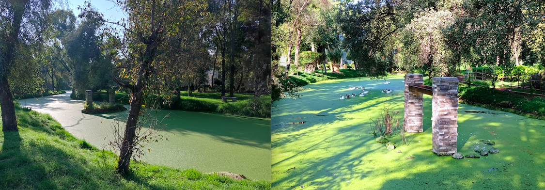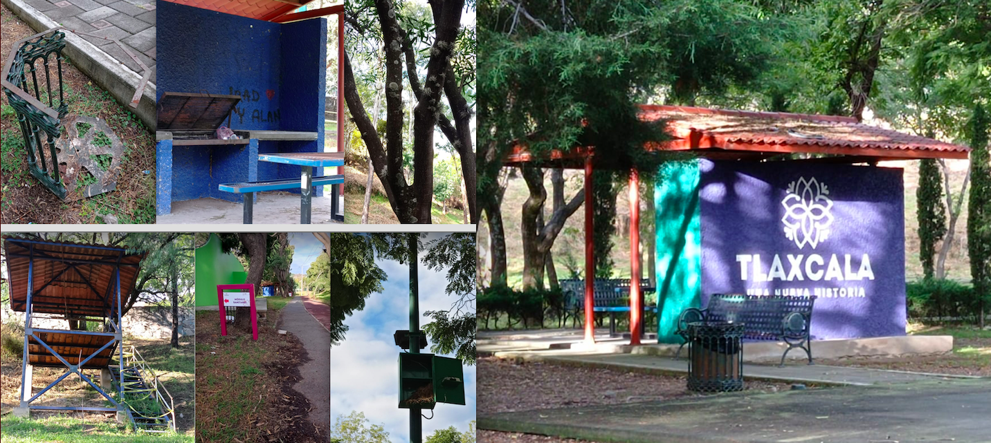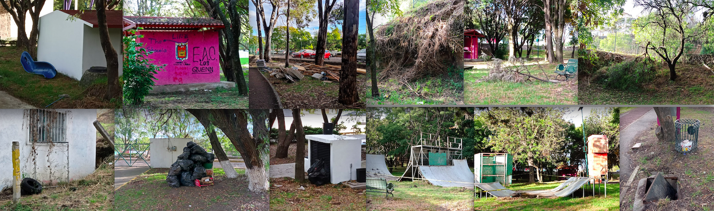 Sólo señalaré las más evidentes, montones de basura, hasta llantas abandonadas; ramas y hojas secas que se ve, llevan meses sin levantar, incluso árboles partidos; edificaciones sin sentido con pintas de grafiti; juegos mecánicos en pedazos; partes inservibles de lo que funcionó como skate park; instalaciones deficientes con asadores, estructuras para botes de basura y bancas en pésimo estado que francamente no creo se antoje a nadie utilizarlas; árboles maltratados y con plaga, escombro por doquier y muchos etc.