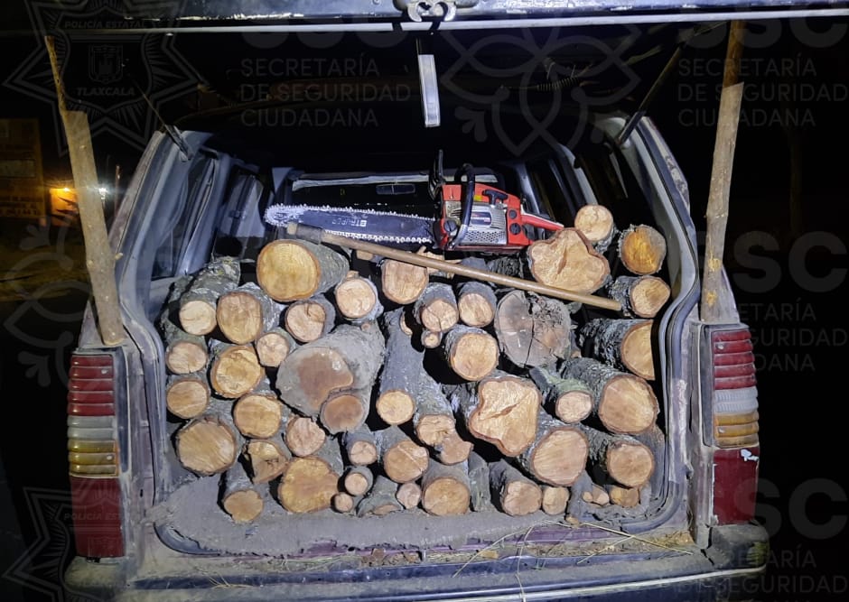 *La unidad vehicular se encontró cargada con troncos de madera, una motosierra y un hacha metálica en San Pablo del Monte