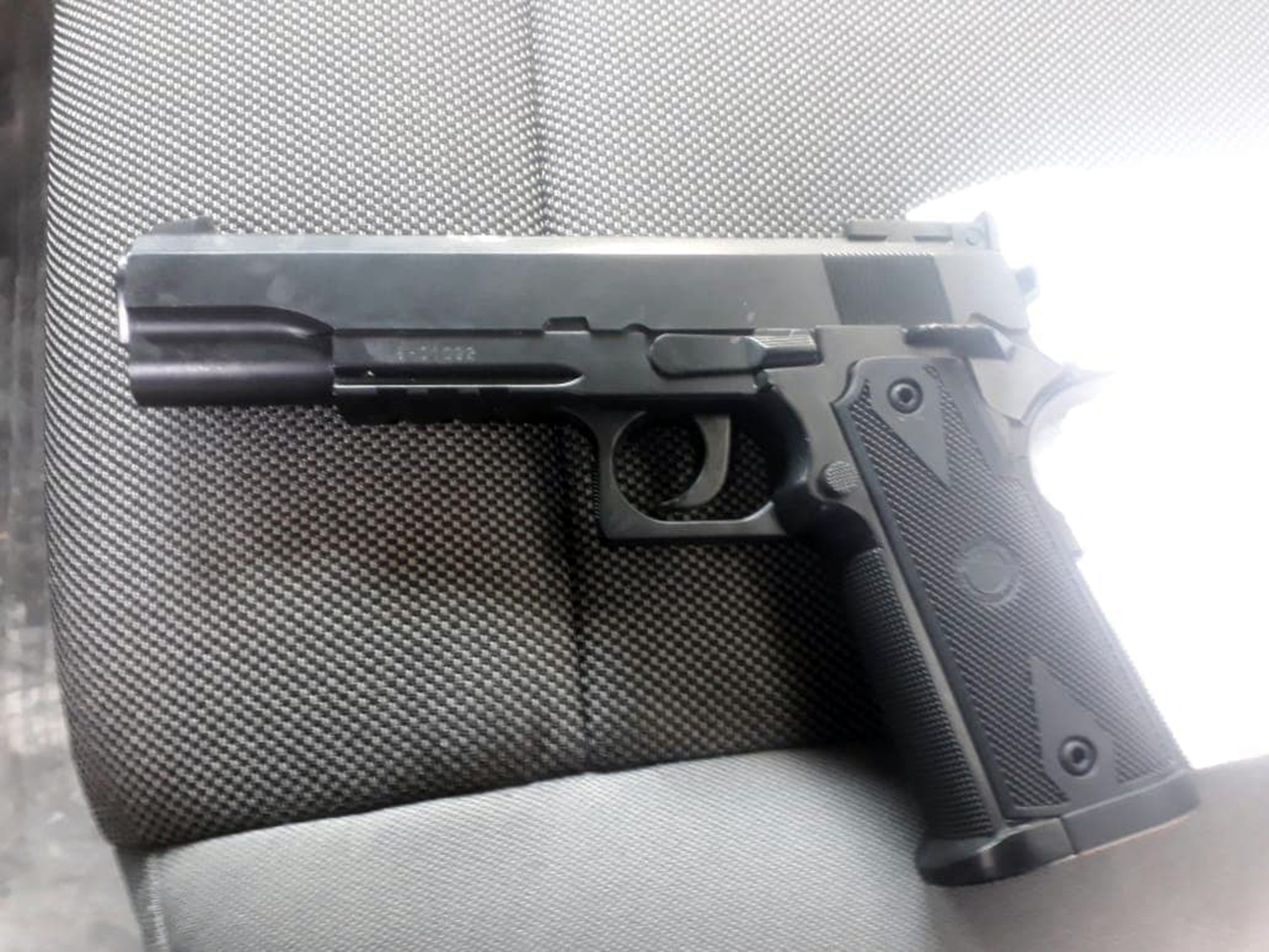 Siendo un comportamiento imprudente que pone en riesgo su integridad, así como de otras personas, procedieron a detener la unidad para inquirir a los sujetos; así como a la realización de una inspección preventiva, encontrando debajo del asiento trasero del vehículo un arma de fuego.