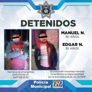 Fue hasta el bulevar Yancuitlalpan esquina con la calle Francisco I. Madero que son alcanzados y abordados, notificándoles el motivo de detención; al solicitarles sus identificaciones, ellos refieren no contar con una en ese momento, pero dicen llamarse Manuel N. y Edgar N., ambos de 30 años de edad y vecinos del estado de Puebla y que habían acudido a comprar una pieza para arreglar un vehículo.