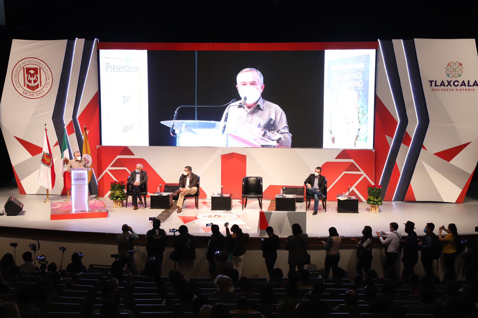 Tlaxcala, Tlax; 7 de diciembre de 2021 (Pulso Red) El titular de la Secretaría de Gobierno (Segob), Sergio González Hernández acudió al Centro Cultural Universitario (CCU) de la Universidad Autónoma de Tlaxcala (UAT), como invitado especial, a la presentación del nuevo libro del presidente de la República, Andrés Manuel López Obrador, titulado “A la mitad del camino”, en el que se narra el testimonio de los logros alcanzados a tres años de su mandato.