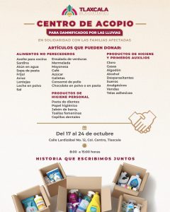 A través de la Coordinación Municipal de Protección Civil, el Ayuntamiento invita a la ciudadanía tlaxcalteca a sumarse a esta causa que refleja el espíritu de empatía y unión que caracteriza a la capital, con donaciones que se recibirán en calle Lardizábal No. 12, colonia Centro, Tlaxcala. Este centro de acopio permanecerá abierto desde este viernes y hasta el 24 de octubre, en un horario de 8:00 de la mañana a 3:00 de la tarde.