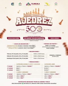Tlaxcala, Tlax; 26 de junio de 2025 (PulsoRed) Con motivo de los festejos por los 500 años de la fundación de la ciudad de Tlaxcala, el Ayuntamiento que preside Alfonso Sánchez García, invita al público en general a participar en el Magno Torneo de Ajedrez organizado por la Escuela Garméndez, un evento que reunirá a entusiastas de este milenario juego de estrategia de todas las edades.