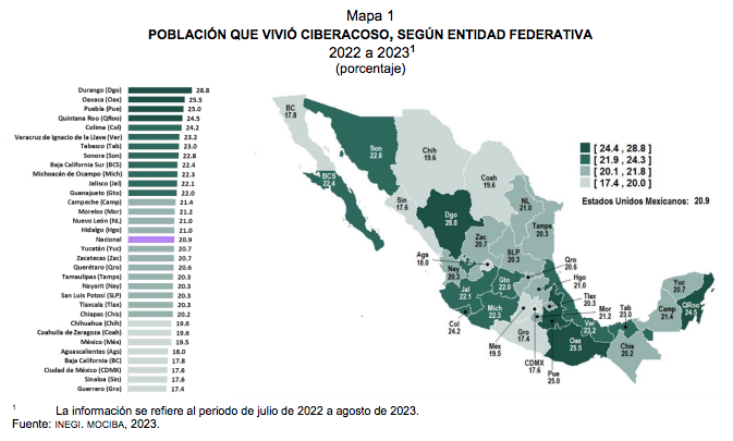Los estados con mayor prevalencia de ciberacoso fueron Durango con 28.8 por ciento, seguido por Oaxaca con 25.5, Puebla con 25.0, Quintana Roo con 24.5 y Colima 24.2.