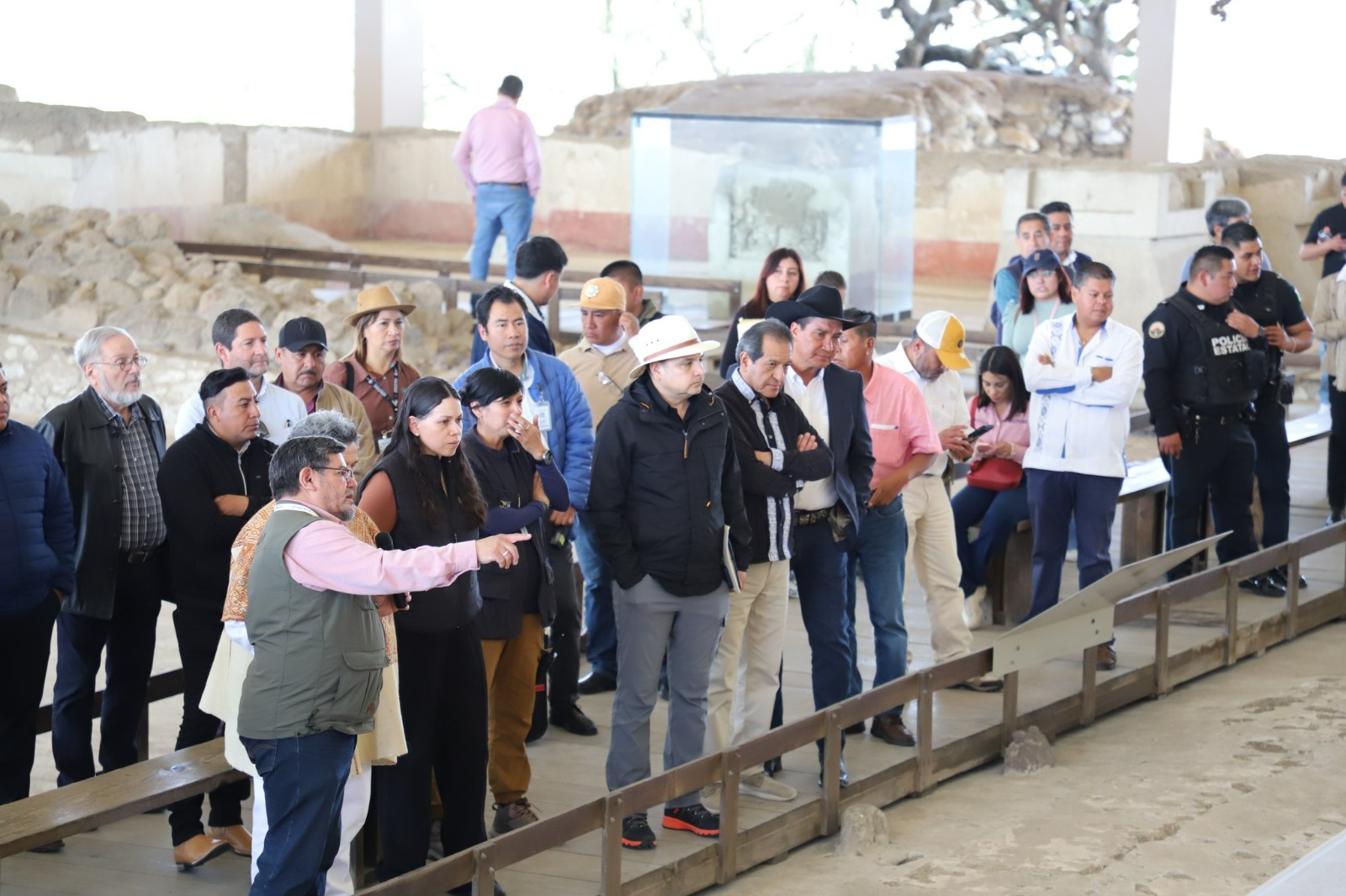 En Cacaxtla, uno de los sitios más emblemáticos del Altiplano Central por sus murales policromados únicos en Mesoamérica, se acordó reforzar las labores de conservación mediante el mantenimiento de la techumbre que protege los pigmentos originales, así como la intervención en la rampa de acceso, con el objetivo de mejorar la experiencia de visitantes bajo criterios de accesibilidad y resguardo patrimonial.