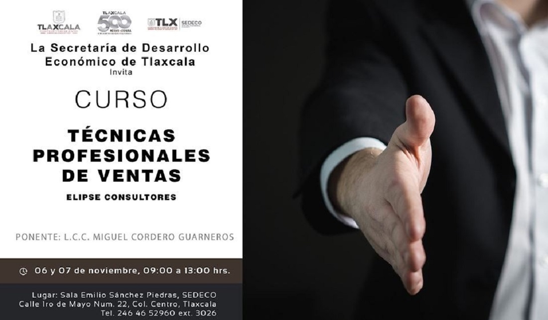 Tlaxcala, Tlax; 4 de noviembre de 2019 (Pulso) La Secretaría de Desarrollo Económico (Sedeco) invita a los dueños de Micro, Pequeñas y Medianas Empresas (Mipymes) en la entidad, así como a emprendedores y público en general a participar en el curso “Técnicas Profesionales de Ventas” que se llevará a cabo el 6 y 7 de noviembre.