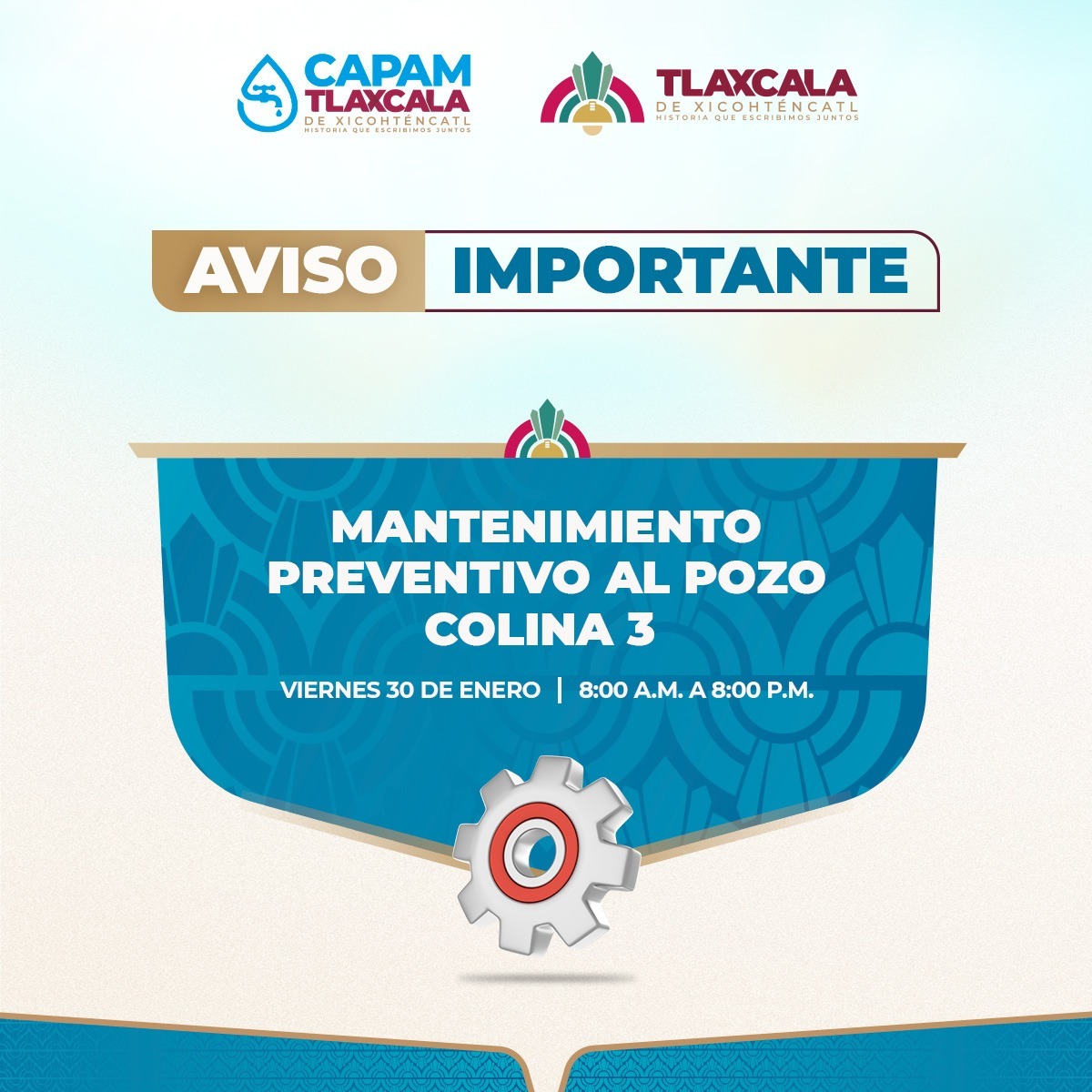 Tlaxcala, Tlax; 29 de enero de 2026 (PulsoRed) Tlaxcala, Tlax; 29 de enero de 2026 (PulsoRed) El Ayuntamiento de Tlaxcala, a través de la Comisión de Agua Potable y Alcantarillado del Municipio (CAPAM), informa a la ciudadanía que el viernes 30 de enero se llevará a cabo un mantenimiento programado en el pozo Colina 3, con el objetivo de preservar el correcto funcionamiento de la infraestructura hidráulica y garantizar la continuidad y calidad del servicio de agua potable.