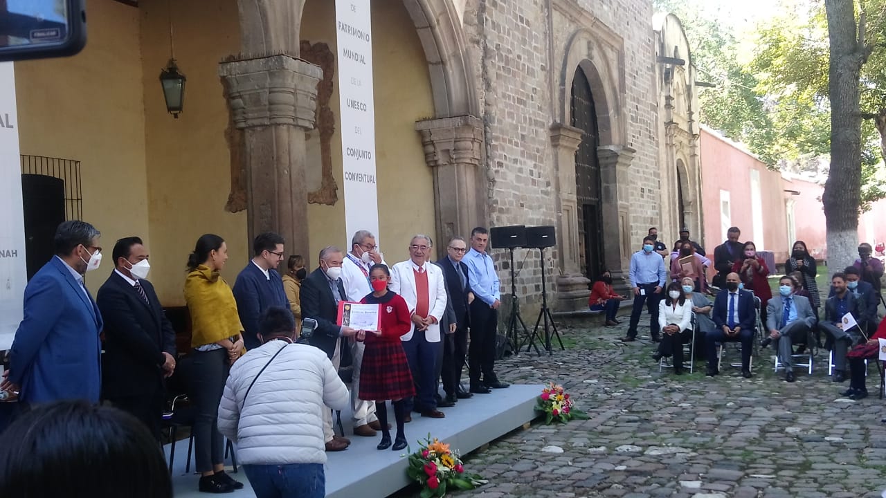 Al exterior del Ex convento de San Francisco de nuestra Señora de la Ascención, autoridades municipales, estatales y federales, celebraron el primer aniversario y entregaron a estudiantes de diversas instituciones públicas, un certificado que los hace acreedores al programa “Guardianes del patrimonio”.
