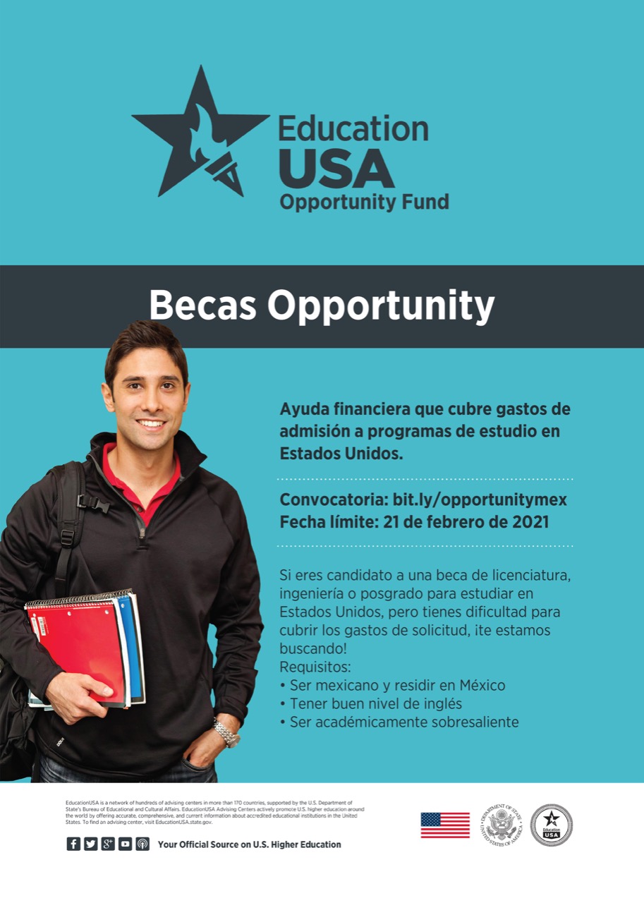 Para aplicar para la beca Opportunity 2021, deberán llenar el formulario en la siguiente dirección electrónica: bit.ly/EdUSA-Beca2021; EducationUSA les enviará un correo electrónico confirmando si han sido aceptados en el mes de marzo.