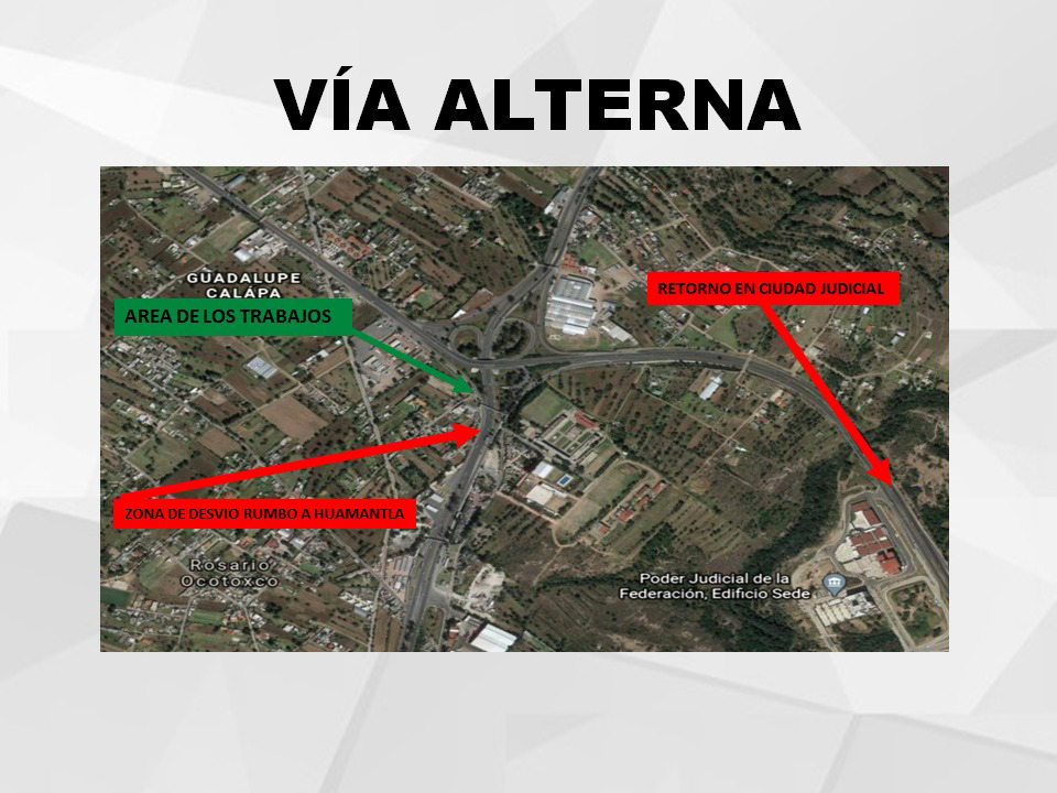 Por tal motivo, se sugiere a los automovilistas utilizar como vía alterna la carretera Amaxac-Apizaco, para posteriormente incorporarse en el retorno ubicado en Ciudad Judicial.