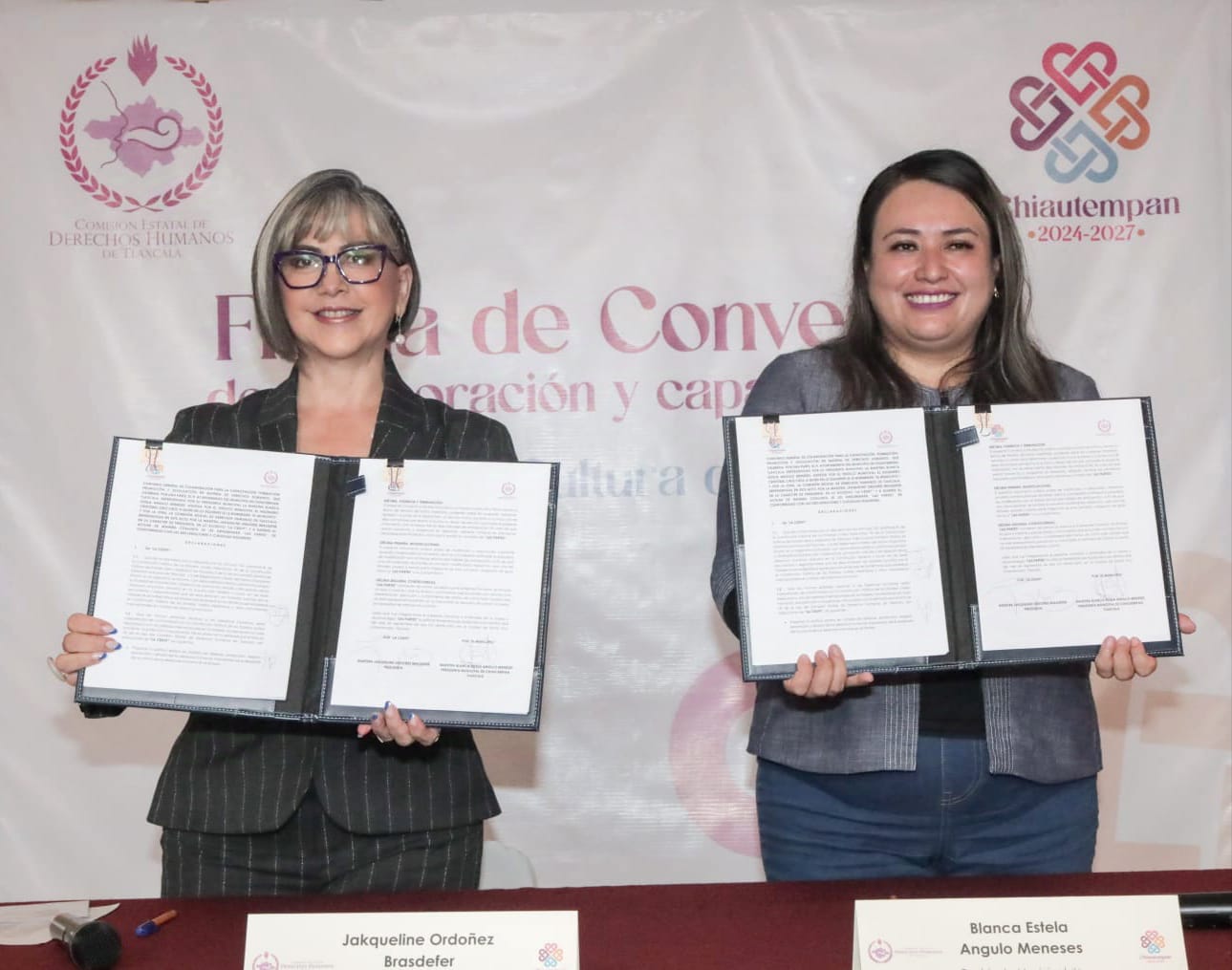 El convenio fue formalizado entre la presidenta municipal, Blanca Angulo Meneses, y la presidenta de la CEDH en Tlaxcala, Jakqueline Ordóñez Brasdefer, en un acto que contó con la presencia de personal administrativo e integrantes del cabildo del Ayuntamiento.