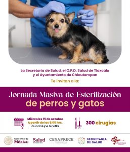 Chiautempan, Tlax; 07 de octubre de 2025 (PulsoRed) En el marco del 4º Taller Nacional de Esterilización Quirúrgica de Perros y Gatos, organizado por la Secretaría de Salud del Gobierno de México y el O.P.D. Salud de Tlaxcala, en coordinación con el Ayuntamiento de Chiautempan, se llevará a cabo una jornada masiva de esterilización gratuita en esta demarcación.