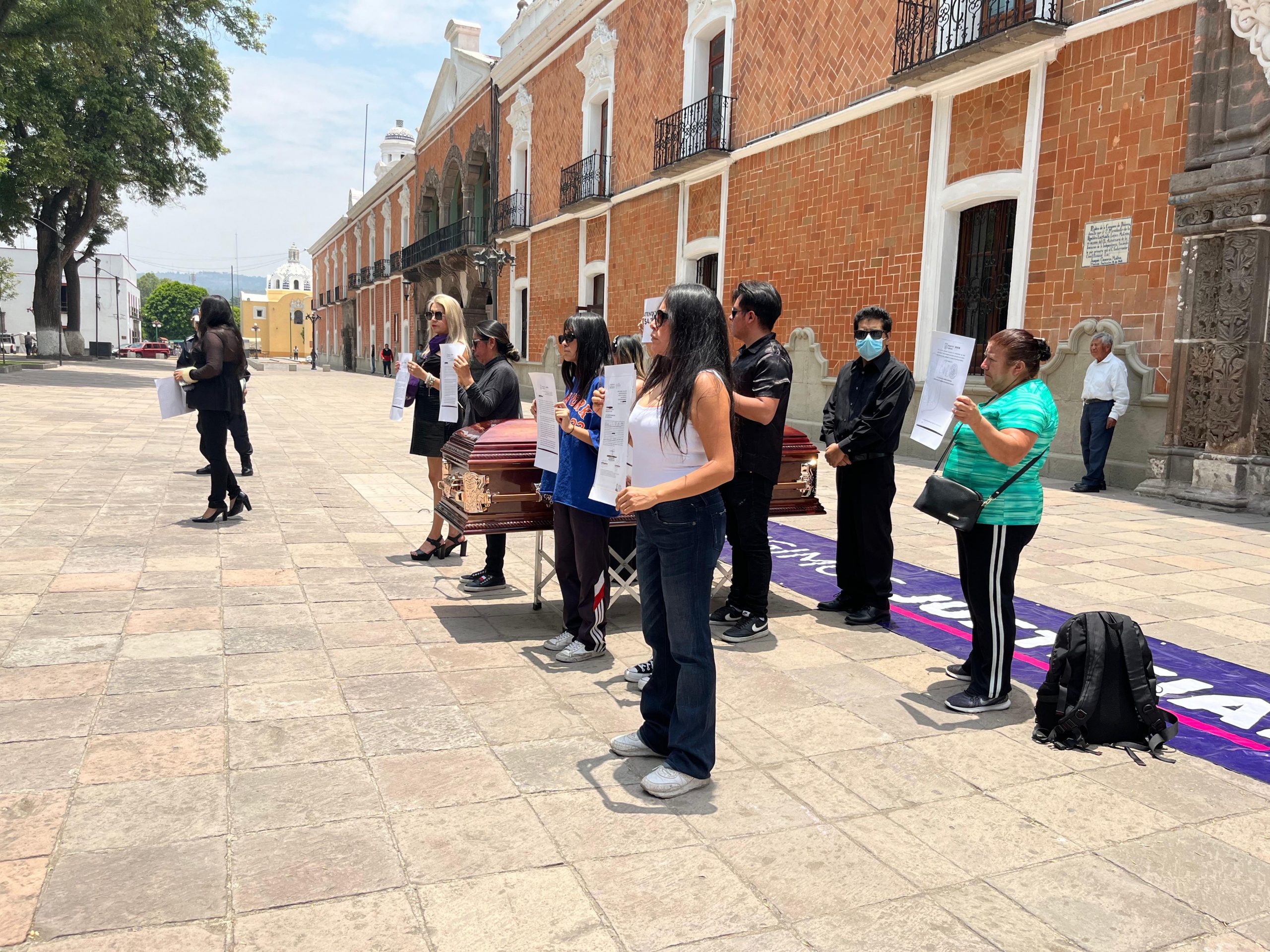 Tlaxcala, Tlax; 04 de junio de 2024 (Selene Sosa) Familiares y compañeros del Sindicato 7 de Mayo protestaron este martes frente a Palacio de Gobierno con la colocación de un féretro para reclamar por la muerte de Leticia N., a causa, aparentemente, del pésimo servicio de salud que recibió.