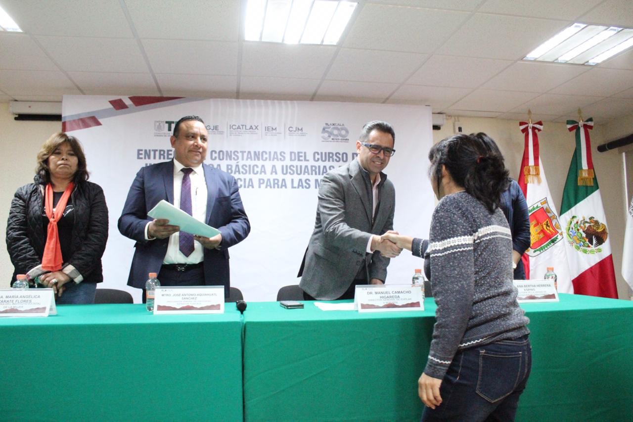 Tlaxcala, Tlax; 15 de diciembre de 2019 (Pulso) El Procurador General de Justicia del Estado, José Antonio Aquiahuatl Sánchez, y el Director General del Instituto de Capacitación para el Trabajo (Icatlax), Manuel Camacho Higareda, entregaron constancias a 18 usuarias del Centro de Justicia para las Mujeres, quienes concluyeron con éxito el curso de “Informática Básica”.