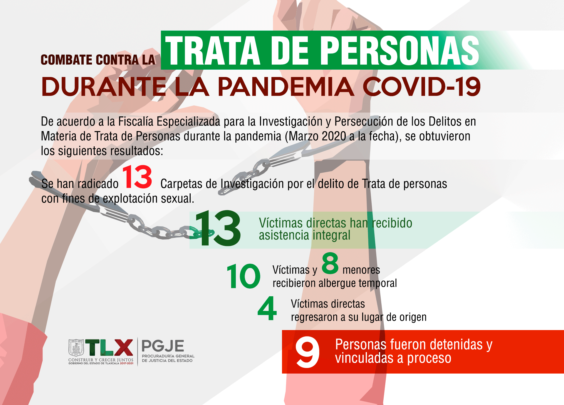 Tlaxcala, Tlax; 26 de enero de 2021 (Pulso) Durante la etapa de confinamiento a consecuencia de la pandemia de Covid-19, que comprende de marzo de 2020 a la fecha, la Fiscalía Especializada para la Investigación y Persecución de los Delitos en materia de Trata de Personas (FEIPDTP) adscrita a la Procuraduría General de Justicia del Estado (PGJE), ha concretado acciones encaminadas a combatir este delito.