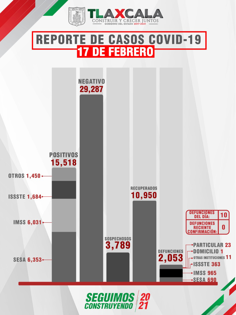 Tlaxcala, Tlax; 18 de febrero de 2021 (Pulso) De acuerdo con el reporte del 17 de febrero, la Secretaría de Salud del Estado (SESA) confirmó 73 personas recuperadas, 10 fallecimientos y 45 casos positivos de Covid-19 de tlaxcaltecas identificados en el estado y cuatro en otras entidades.