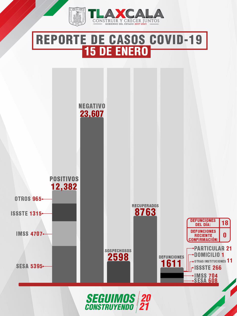 Tlaxcala, Tlax; 16 de enero de 2021 (Pulso) De acuerdo con el reporte del 15 de enero, la Secretaría de Salud del Estado (SESA) confirmó 86 personas recuperadas, 18 fallecimientos y 114 casos positivos de Covid-19 de tlaxcaltecas identificados en el estado y ocho en otras entidades.