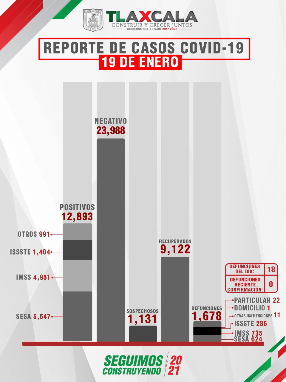 Tlaxcala, Tlax; 20 de enero de 2021 (Pulso) EDe acuerdo con el reporte del 19 de enero, la Secretaría de Salud del Estado (SESA) confirmó 70 personas recuperadas, 18 fallecimientos y 122 casos positivos de Covid-19 de tlaxcaltecas identificados en el estado y 5 en otras entidades.
