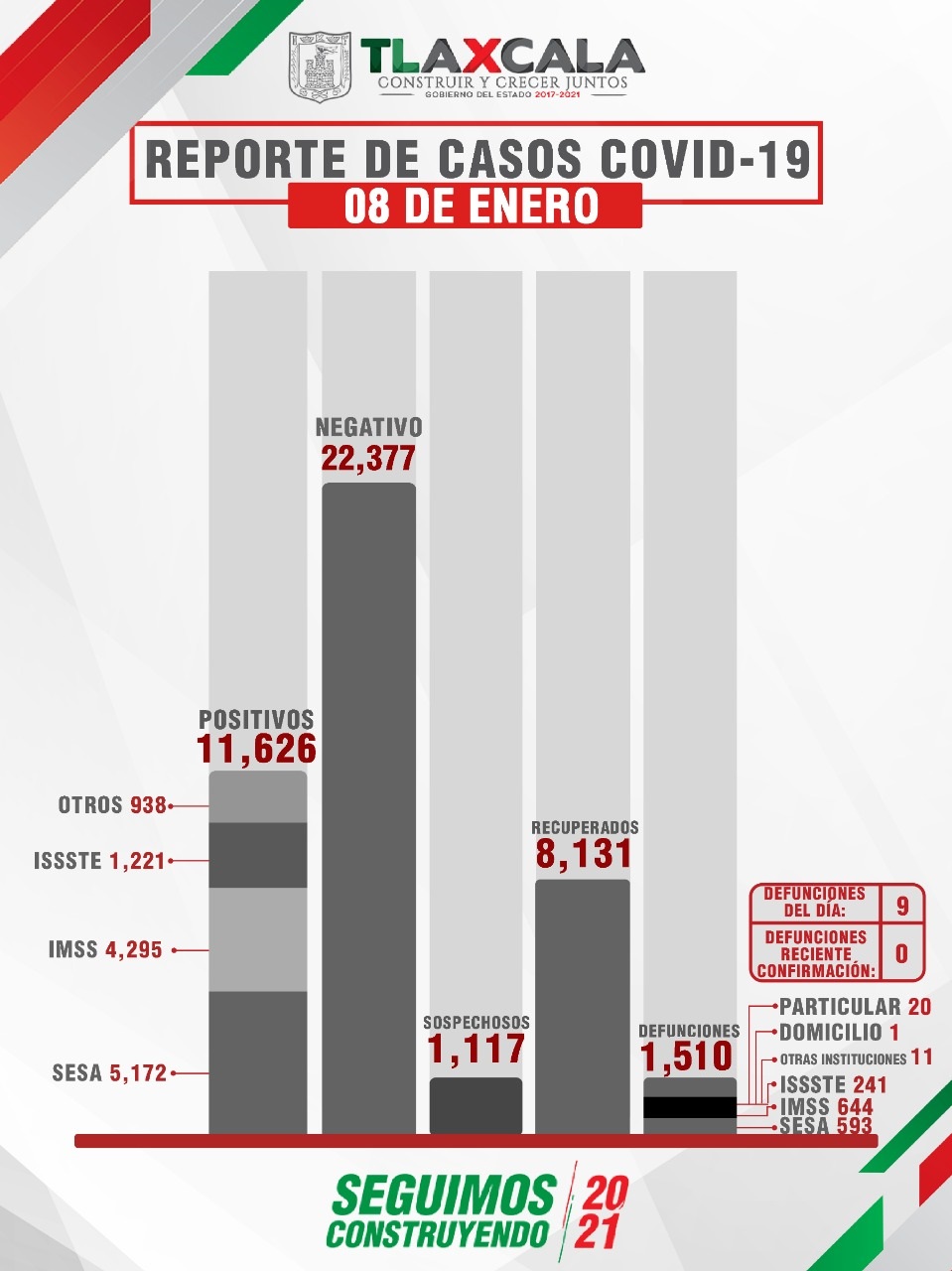Tlaxcala, Tlax; 9 de enero de 2021 (Pulso) De acuerdo con el reporte del 08 de enero, la Secretaría de Salud del Estado (SESA) confirmó 22 personas recuperadas, 9 fallecimientos y 85 casos positivos de Covid-19 de tlaxcaltecas identificados en el estado y cinco en otras entidades.