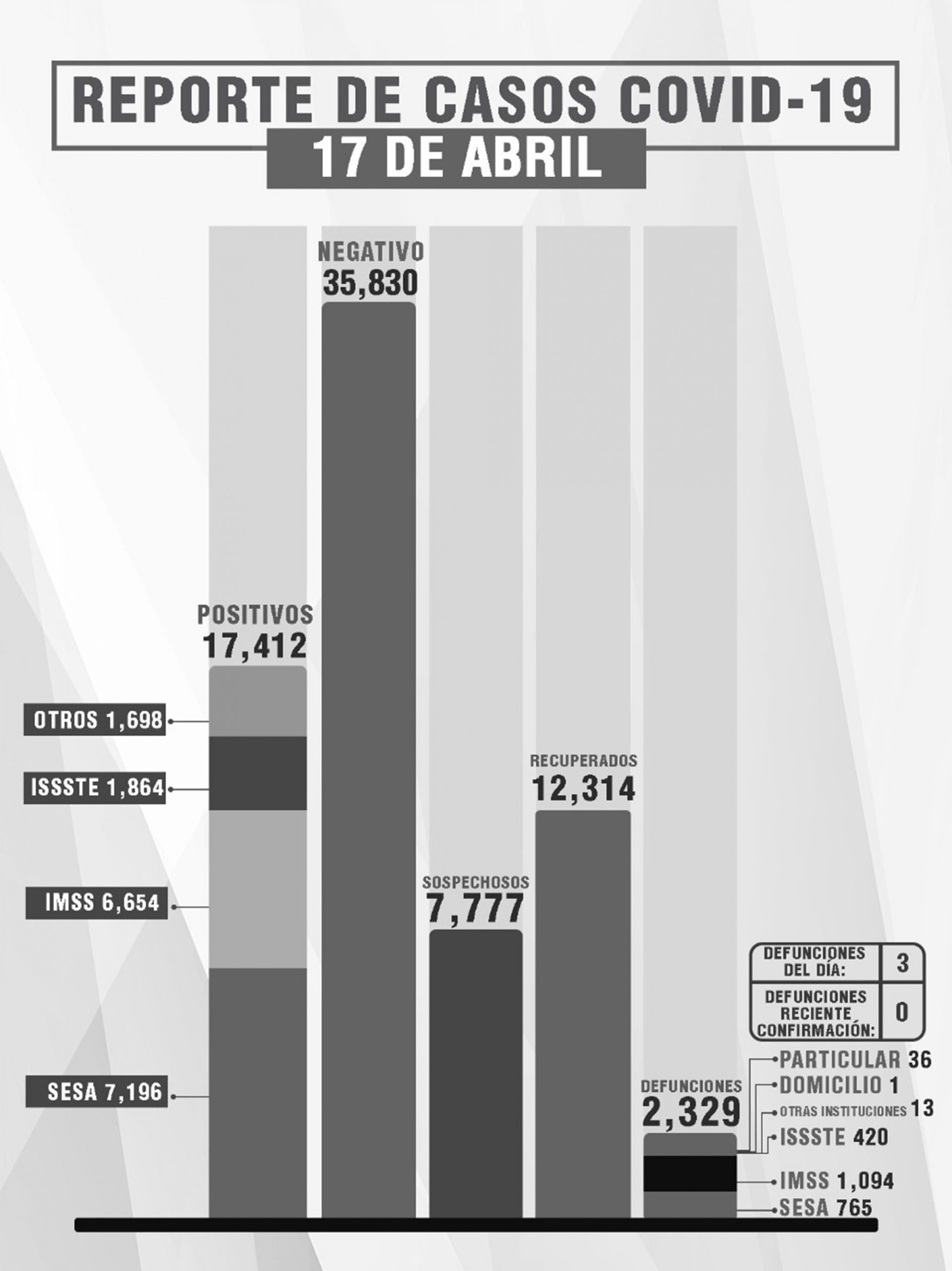 Mientras, del total de fallecimientos, 765 se han registrado en la SESA, mil 94 en el IMSS, 420 en el Issste, 13 en otras instituciones, uno en domicilio particular y 36 en hospital privado.