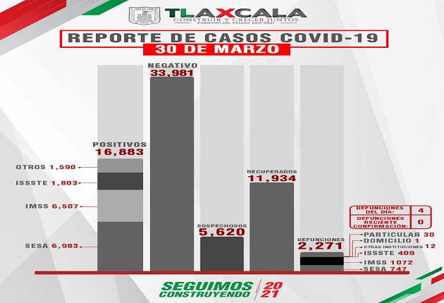 Tlaxcala, Tlax; 31 de marzo de 2021 (Pulso) De acuerdo con el reporte del 30 de marzo, la Secretaría de Salud del Estado confirmó 8 personas recuperadas, 4 fallecimientos y 23 casos positivos de Covid-19 de tlaxcaltecas identificados en el estado y uno en otra entidad.