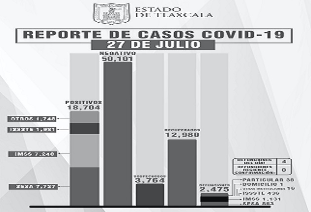 Tlaxcala, Tlax; 28 de julio de 2021 (Pulso) De acuerdo con el reporte del 27 de julio, la Secretaría de Salud del Estado (SESA) confirmó 13 personas recuperadas, cuatro fallecimientos y 40 casos positivos de Covid-19 de tlaxcaltecas identificados en el estado y cinco en otras entidades.