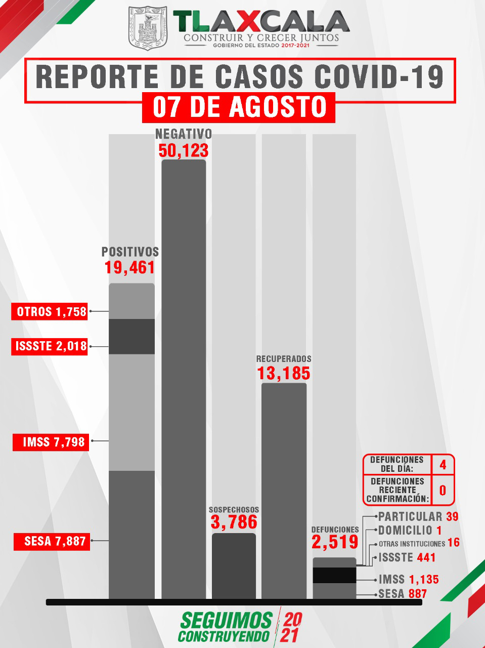 Tlaxcala, Tlax; 8 de agosto de 2021 (Pulso) De acuerdo con el reporte del 07 de agosto, la Secretaría de Salud del Estado (SESA) confirmó 22 personas recuperadas, cuatro fallecimientos y 77 casos positivos de Covid-19 de tlaxcaltecas identificados en el estado y tres en otras entidades.