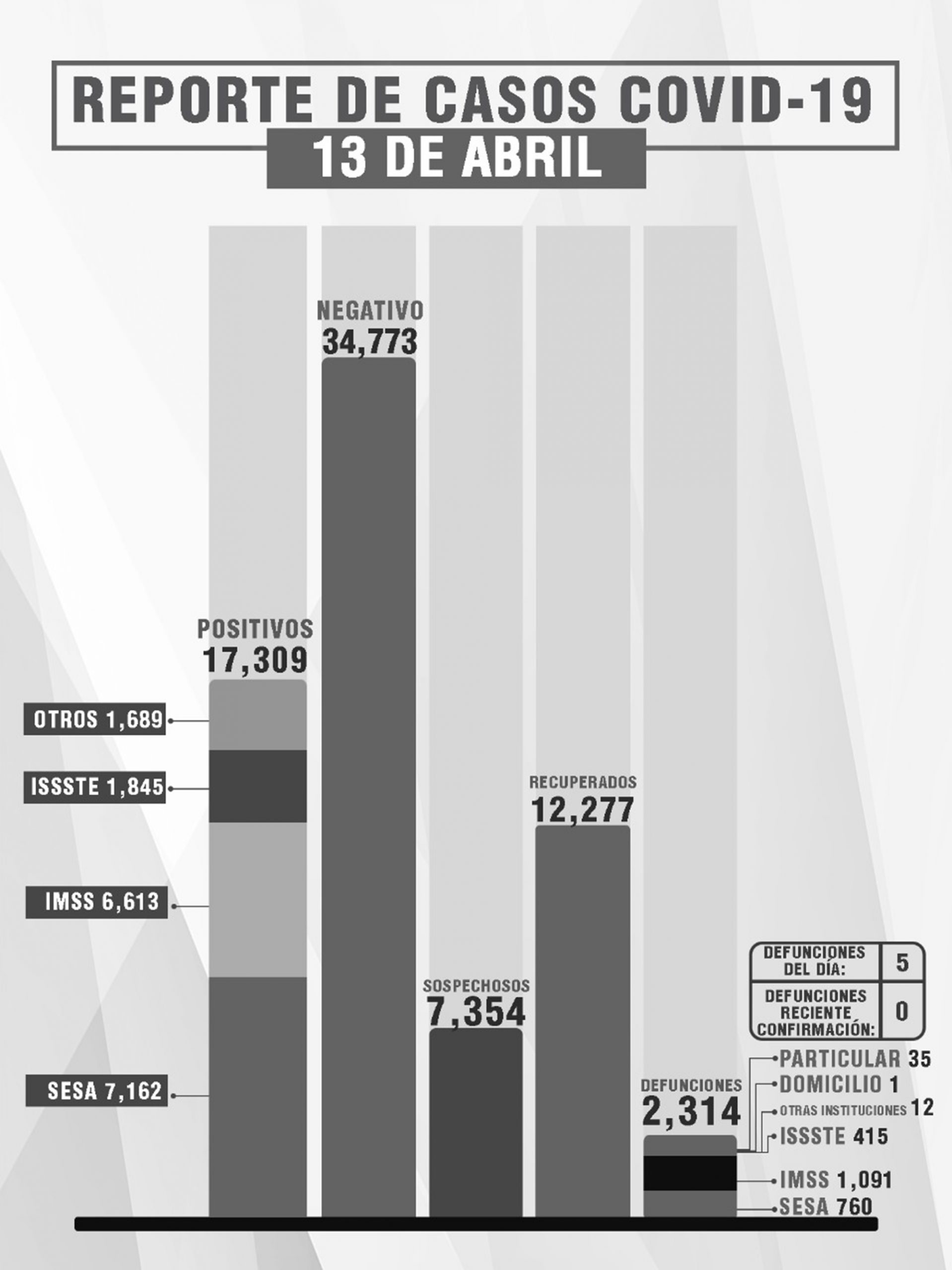Mientras, del total de fallecimientos, 760 se han registrado en la SESA, mil 91 en el IMSS, 415 en el Issste, 12 en otras instituciones, uno en domicilio particular y 35 en hospital privado.