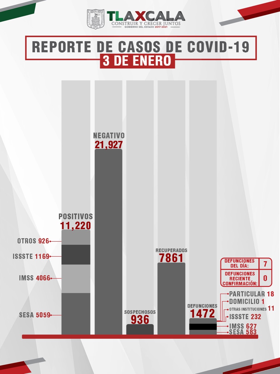 Tlaxcala, Tlax; 4 de enero de 2021 (Pulso) De acuerdo con el reporte del 03 de enero, la Secretaría de Salud del Estado (SESA) confirmó 73 personas recuperadas, 7 fallecimientos y 73 casos positivos de Covid-19 de tlaxcaltecas identificados en el estado y cinco en otras entidades.