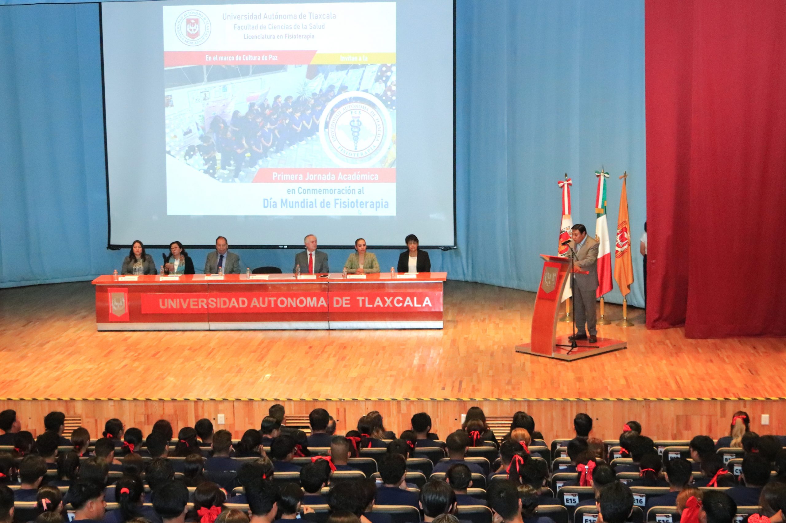 Ante los 361 estudiantes de la Licenciatura en Fisioterapia reunidos en el Teatro Universitario, el Maestro José Reyes Luna Ruíz, Coordinador de la División en Ciencias Biológicas, en representación del Doctor Serafín Ortiz Ortiz, Rector de la UATx, precisó que este encuentro académico formativo busca resaltar el papel fundamental del fisioterapeuta, para promover la rehabilitación y  mejorar la calidad de vida  de las personas en los sistemas de salud  y fomentar la actualización continua a fin de  generar la reflexión crítica y el intercambio de saberes entre estudiantes y  docentes.